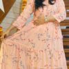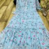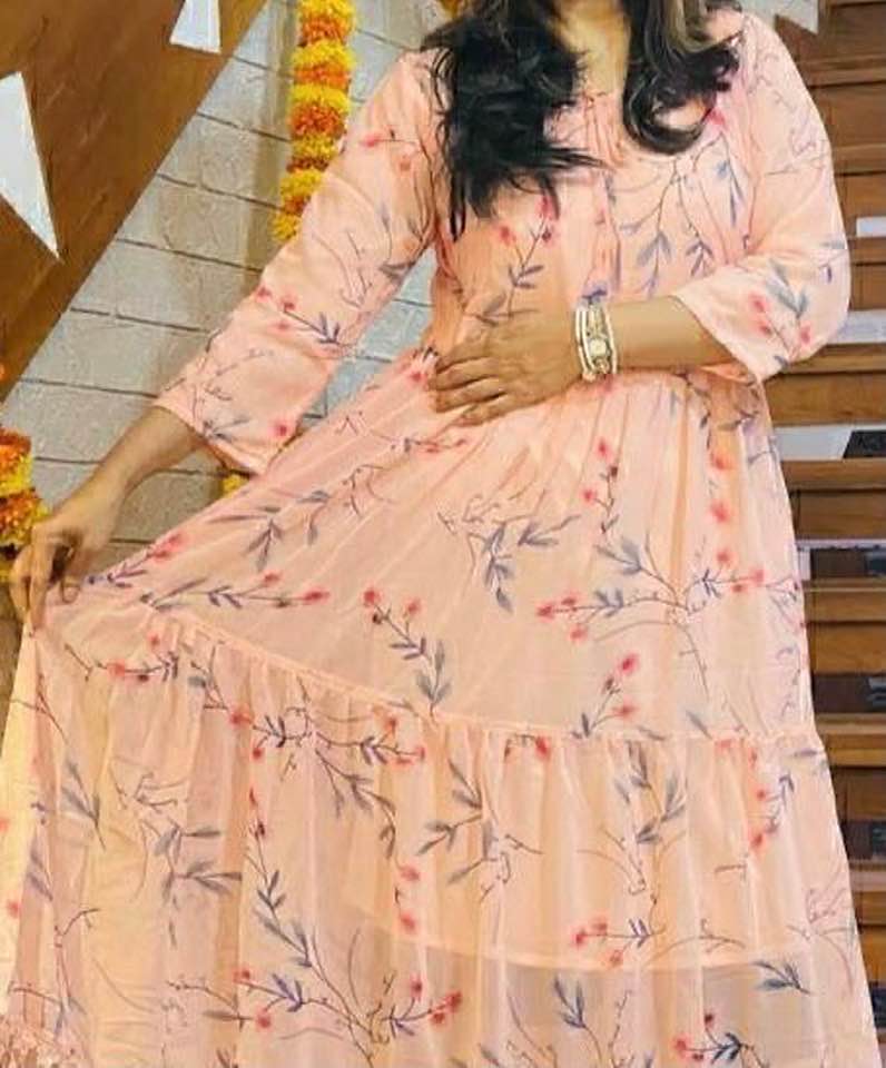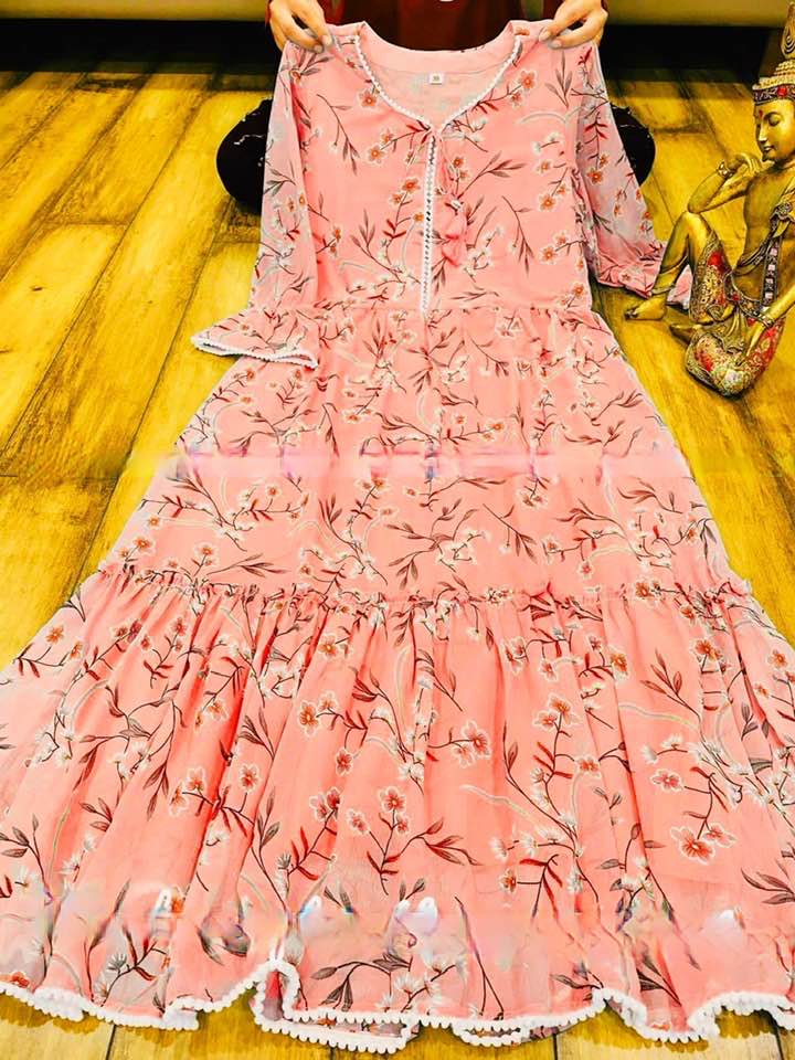 Premium fox Georgette with Tier pattern with floral gown with beautiful PomPom lace and frill and bori.