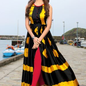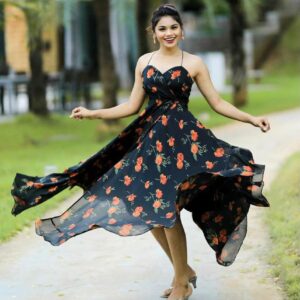 This Beautiful Floral Orange And Black Print Georgette Maxi Is A Must Have This Summer Season Perfect For The Beach Vacation To All The Pool Parties .