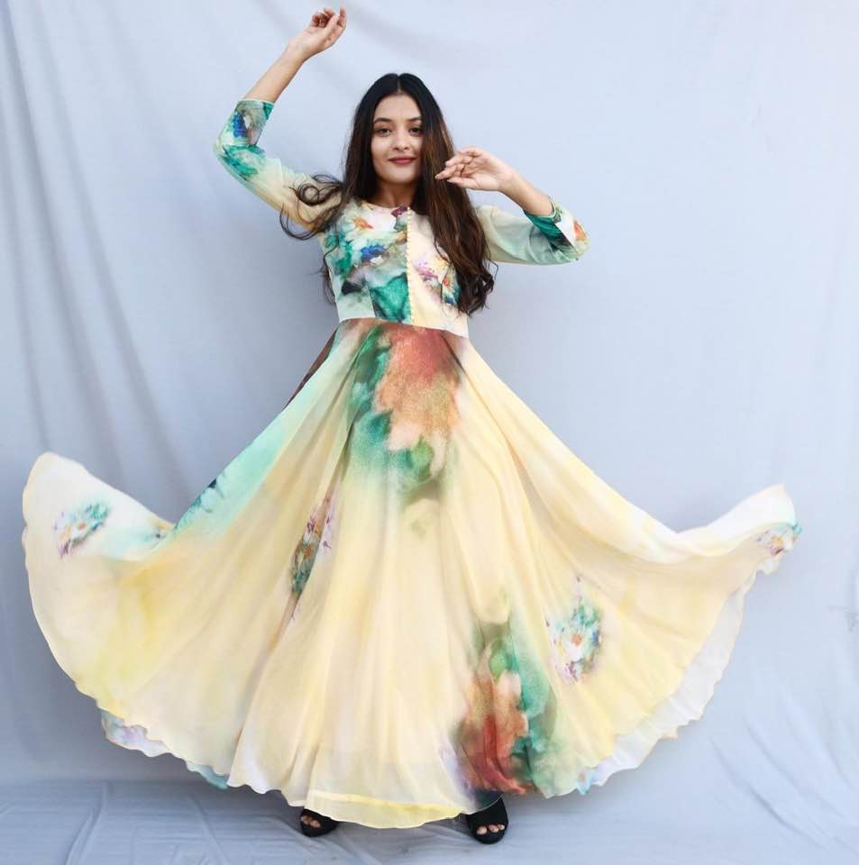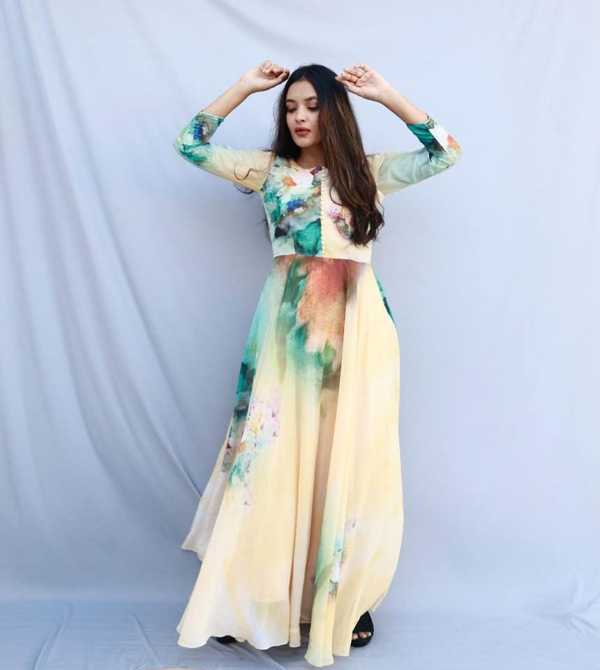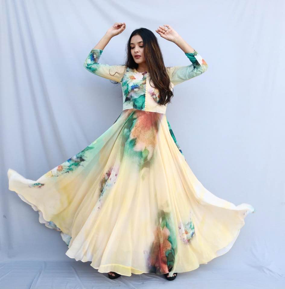 This Yellow print maxi dress is a perfect pretty look. The contrasting light colours complement each other. The Dress made in georgotee print is refreshing and cold shoulder sleeve is adding perfection to the westen look.