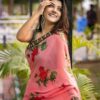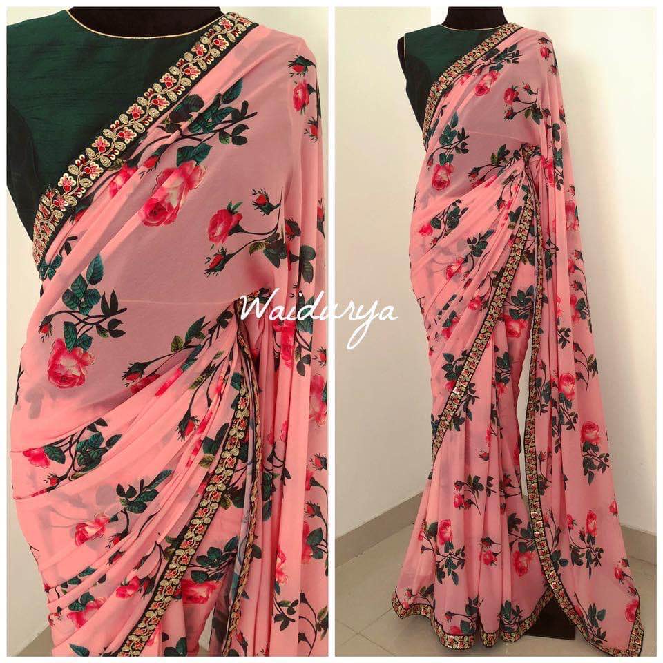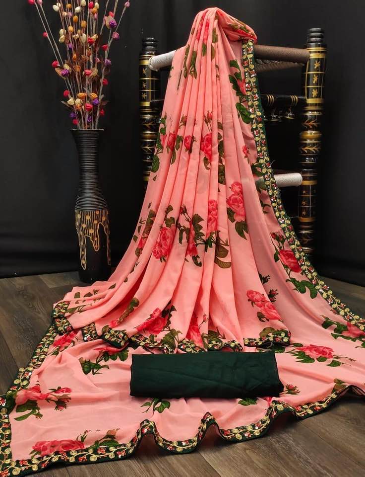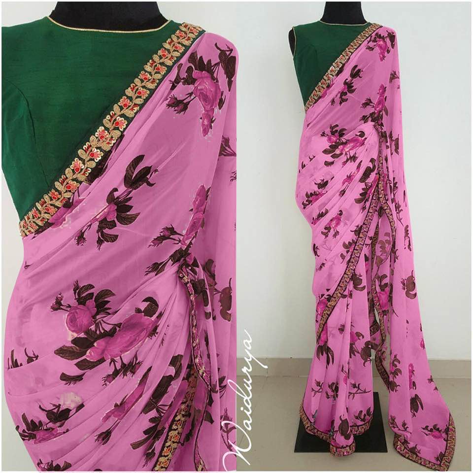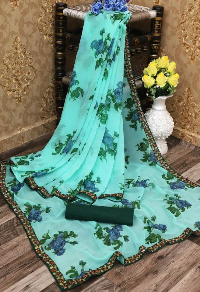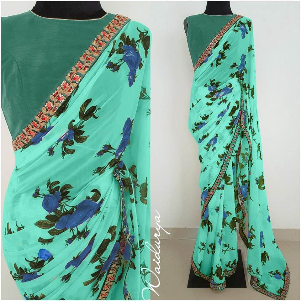 Looking some one for this same colour beautiful Designer Saree on premium Georgette fabric with print and embroidery lace border