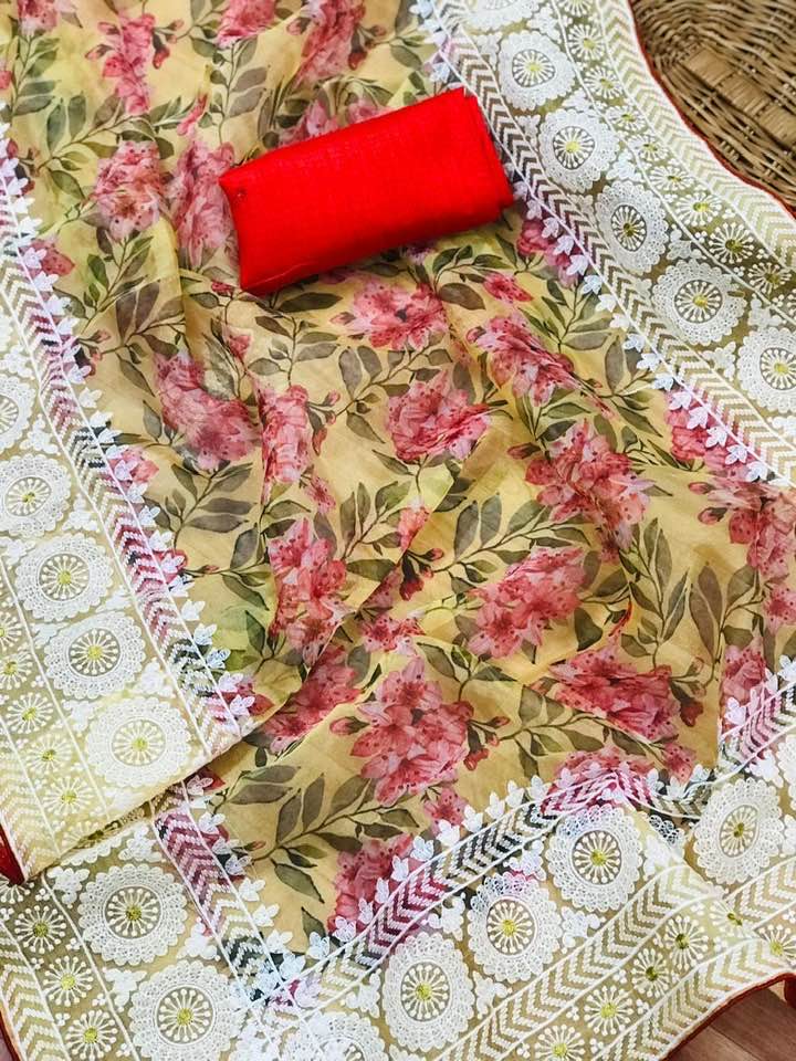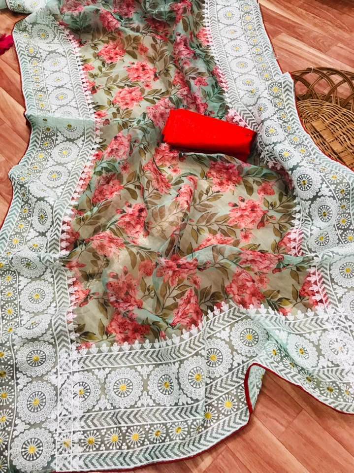 Superb Soft Digital Printed Refined Organza Silk Saree With Lucknowi Thread Chikankari Work In Pallu n Border With Banglori Silk Blouse